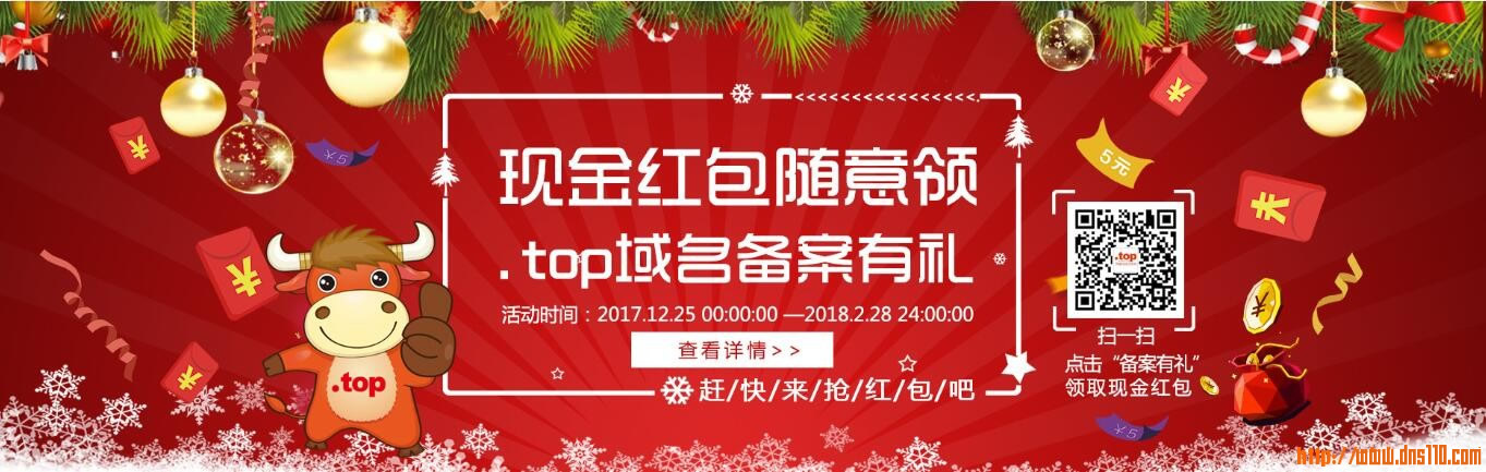 為慶祝圣誕、元旦雙節,凡在活動期間(2017.12.25 00:00:00 —2018.2.28 24:00:00)注冊的 .top域名且進行備案使用,均可在top域名官方公眾號參與“備案領紅包活動”,領取備案紅包。